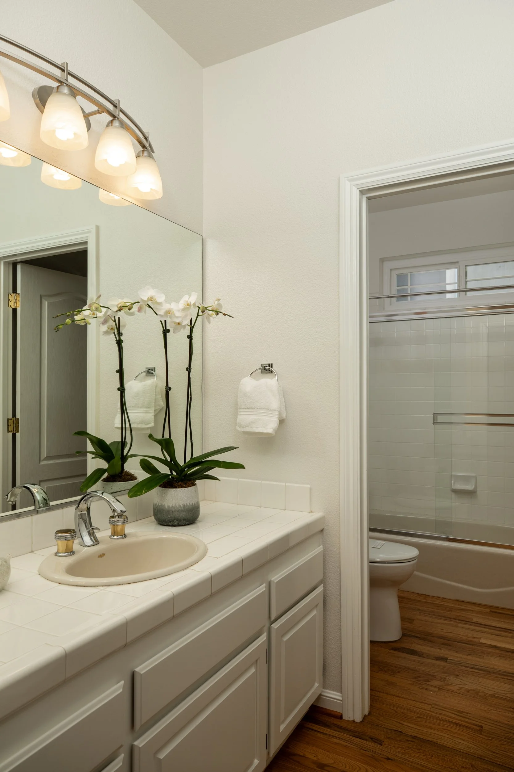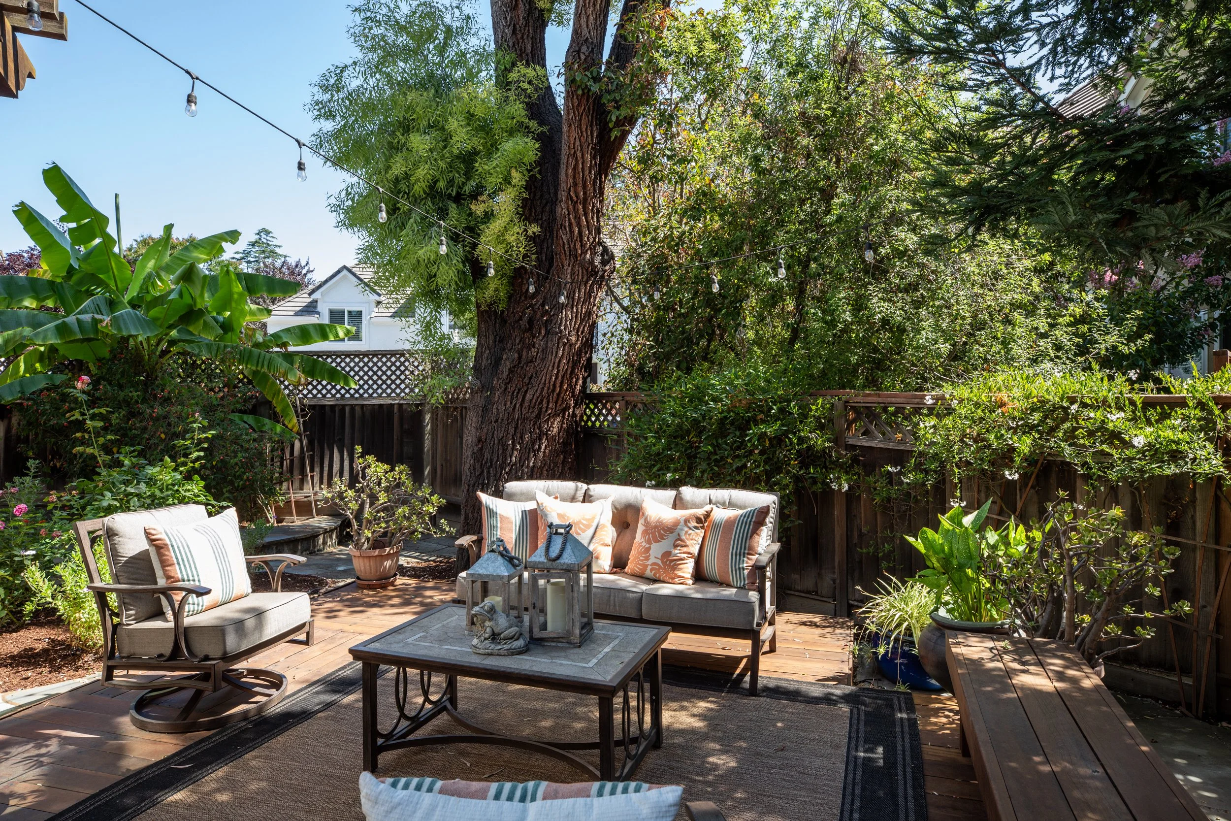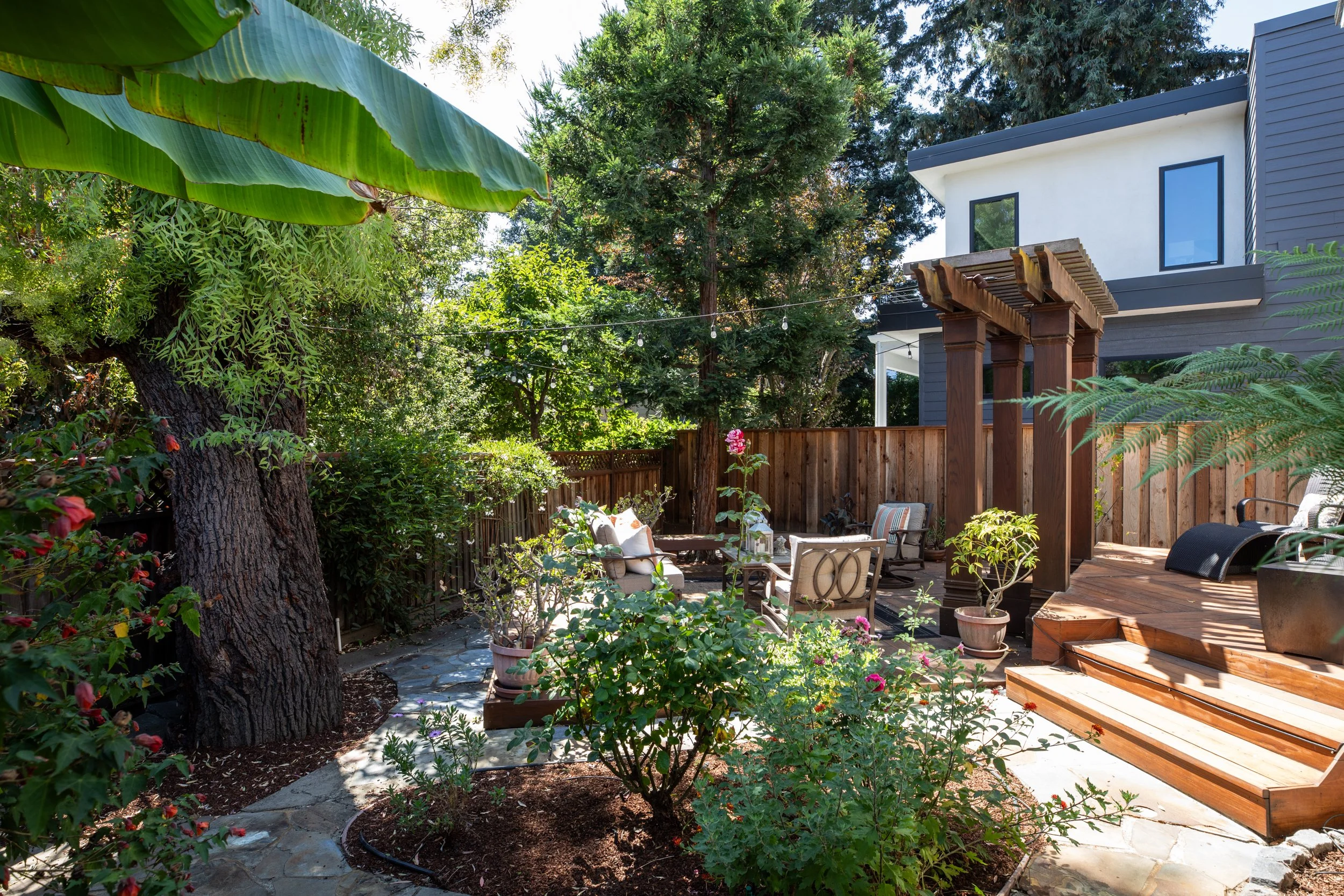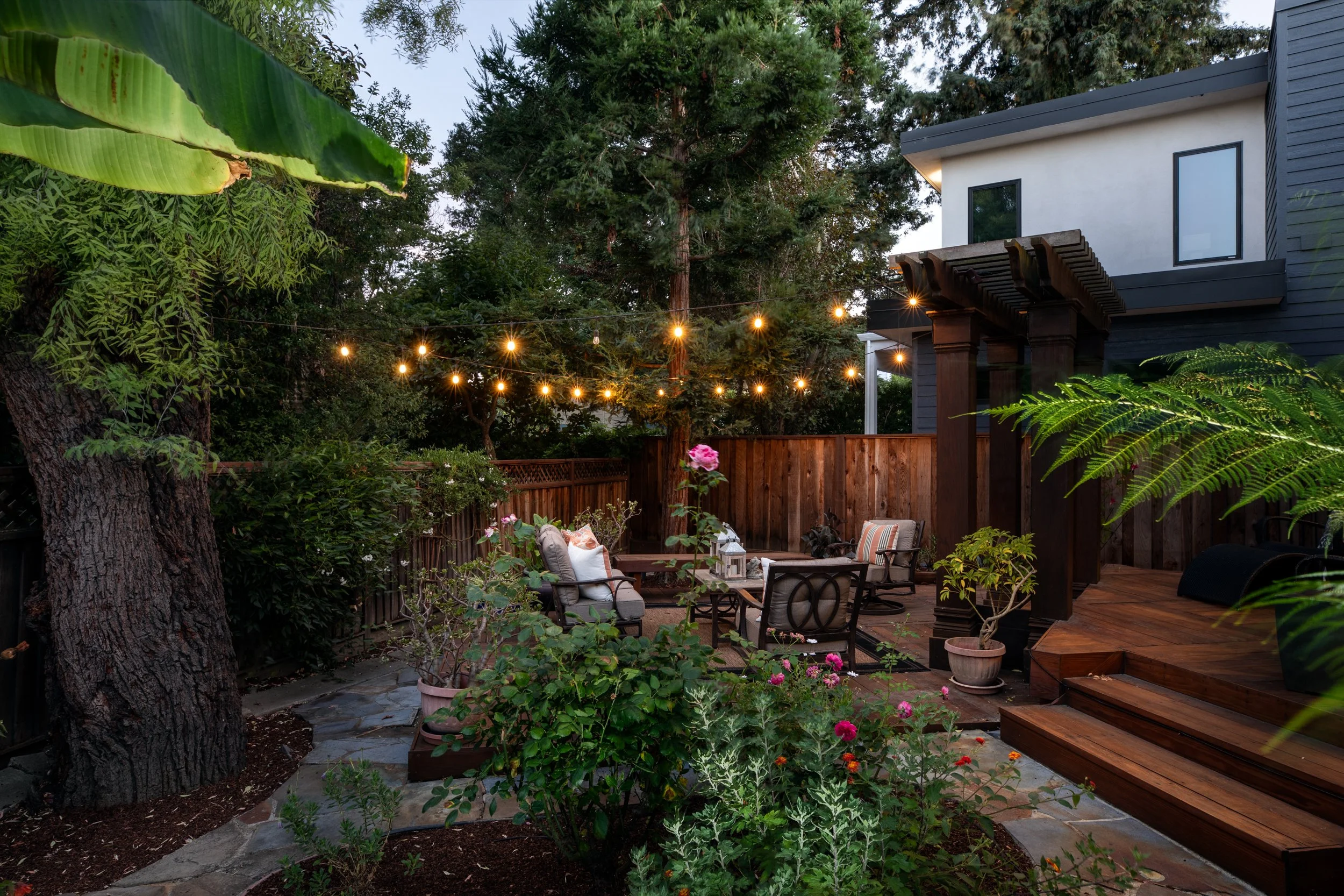 Outside, nature and community embrace you. Dine al fresco on the flagstone patio off the formal dining room. Host warm summer gatherings under the redwood arbor and festive cafe lighting. Unwind on the deck surrounded by tropical greenery. Walk 5 minutes to a neighborhood park. A white picket fence adds timeless charm to the front yard—a quiet promise of home.